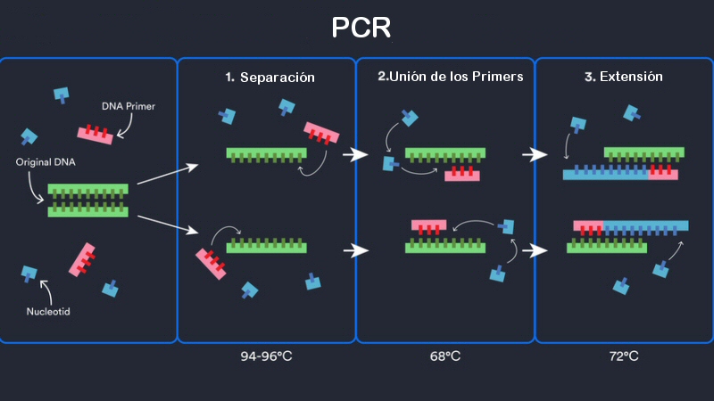 Ahora se necesitarían en el entorno unas condiciones parecidas a las que operan cuando se produce una Reacción en Cadena de la Polimerasa (PCR). La técnica de la PCR es muy conocida. Es capaz de obtener un gran número de copias de un molde pequeño de ADN o ARN. Se emplean una enzima polimerasa combinada con ciclos de bajas y altas temperaturas alternadas, más nucleótidos libres. A altas temperaturas los puentes de hidrógeno que unen los nucleótidos se rompen y las dos hebras de ADN se separan, permitiendo que la polimerasa actúe y forme una copia de cada una de las hebras mientras baja la temperatura, uniendo los nucleótidos complementarios. Cuando termina de bajar la temperatura, el ADN recobra su forma, pero cada cadena se ha replicado. Cada ciclo duplica el número de copias, pudiendo llegar a una amplificación enorme del oligonucleótido inicial.